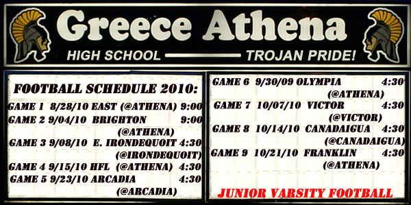 Info:We are beginning a new era of Greece Athena Trojans Football. Having been through this with my older son (Class of 2002), let me say these will be fun times. As many of you know me from Greece Chargers youth football, I take pictures. Lots of them. About 200-400 or more per game. You will see the images on this site. I will also post information fed to me via our (your) coaches. Keep in mind, This is J.V. only. I do not have the badwidth to cover all grades. Good luck to the class of 2011 Varsity players, see www.greeceathenafootball.com for varsity info until next year. This will be your last year, enjoy the final chapter in Greece Athena Football...Keep in mind, For other great sites, check out www.greecethunder.com. You can see many of your teammates playing Lacrosse!